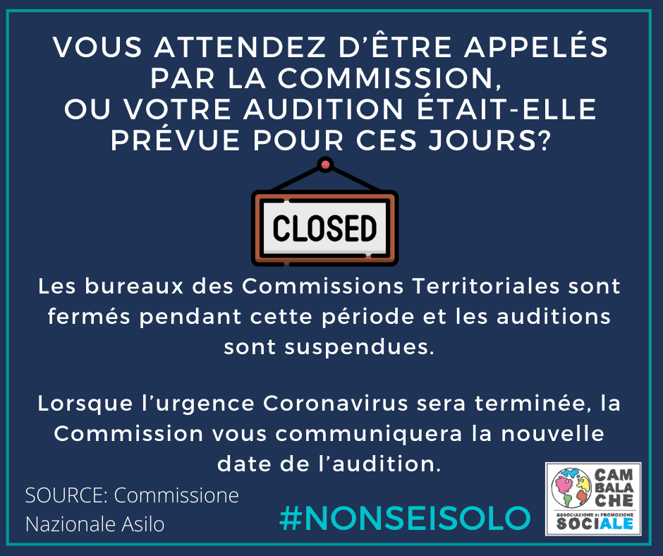 Les bureaux des Commissions Territoriales sont fermés pendant cette période et les auditions sont suspendues. Lorsque l’urgence Coronavirus sera terminée, la Commission vous communiquera la nouvelle date de l’audition.