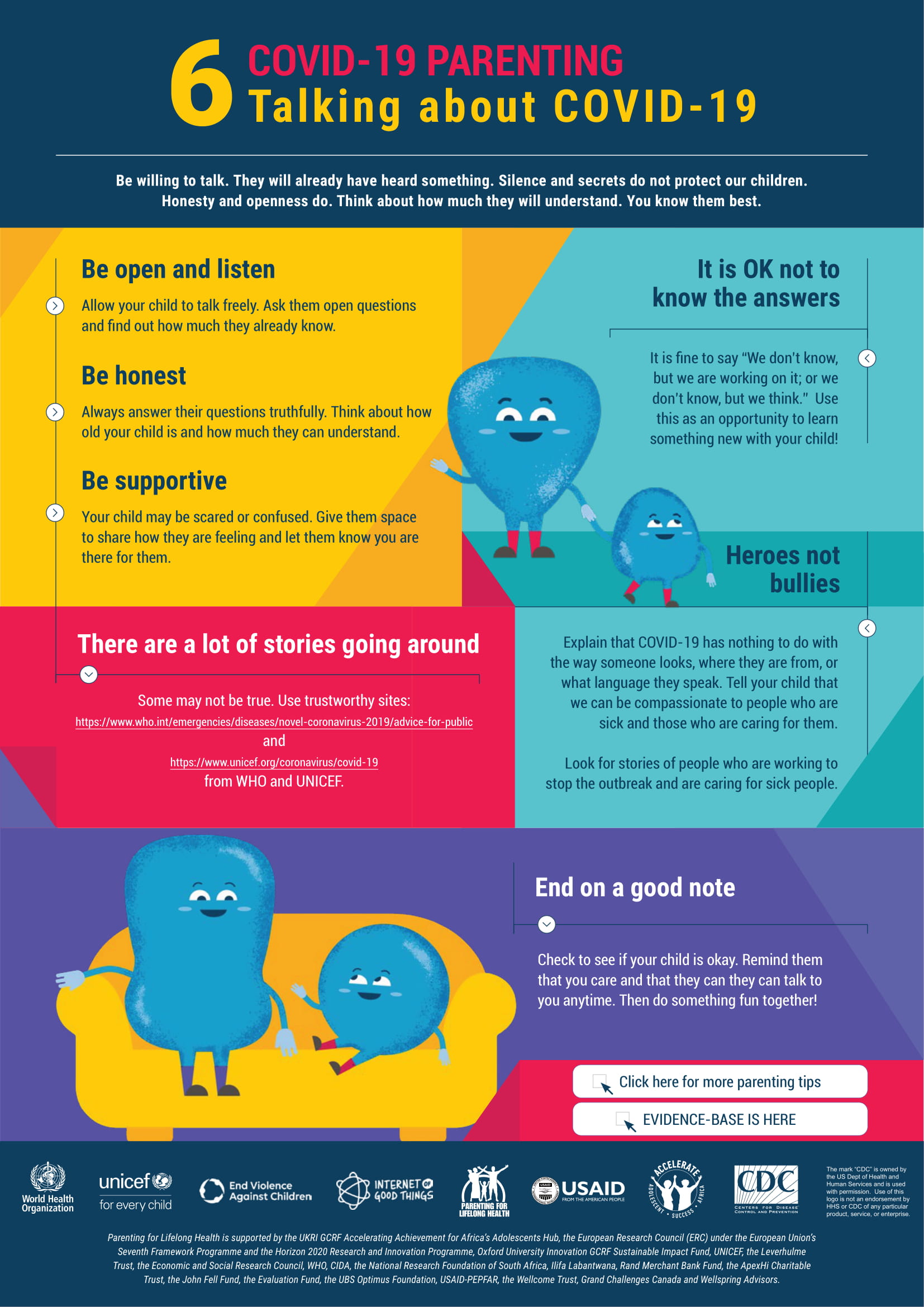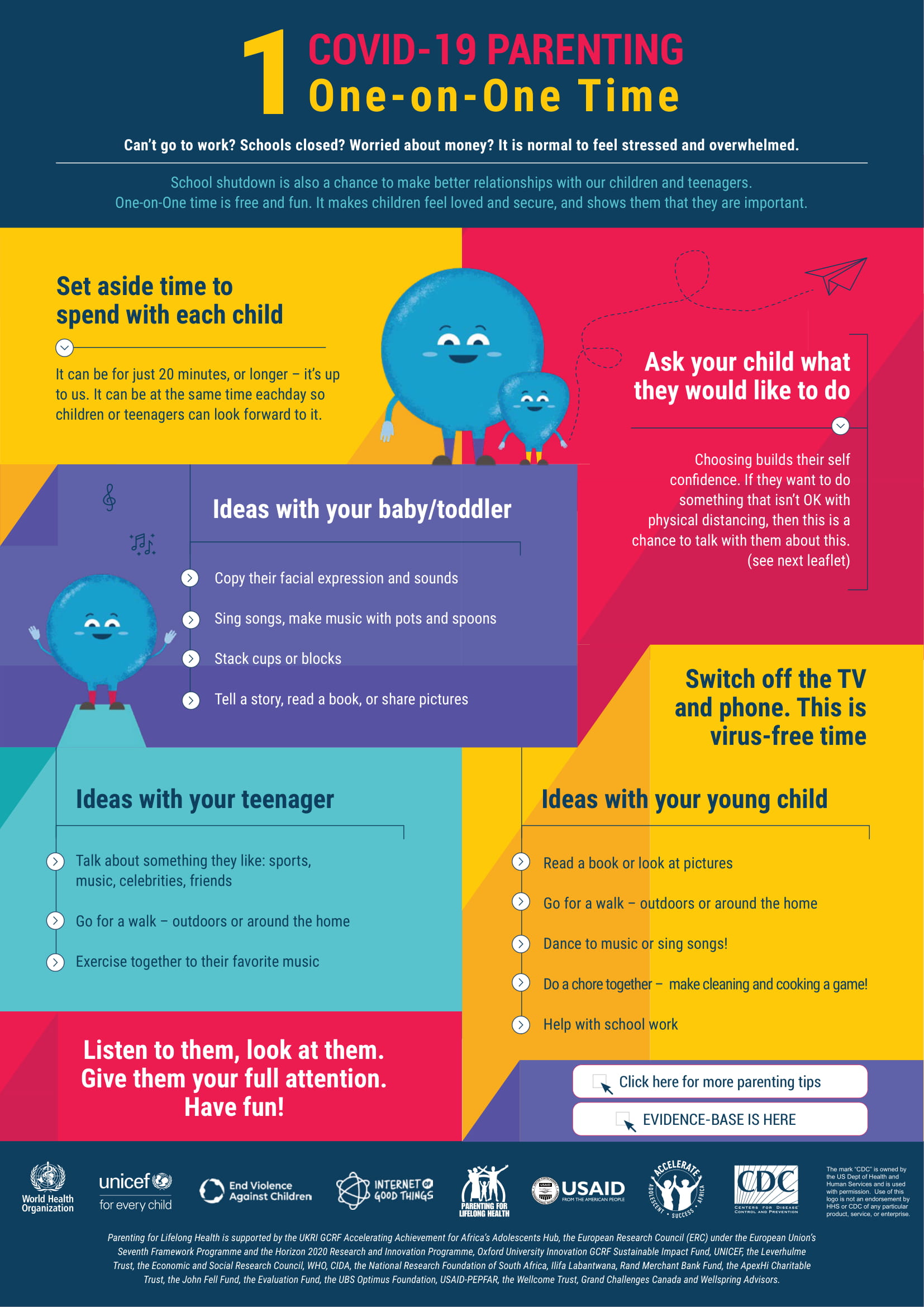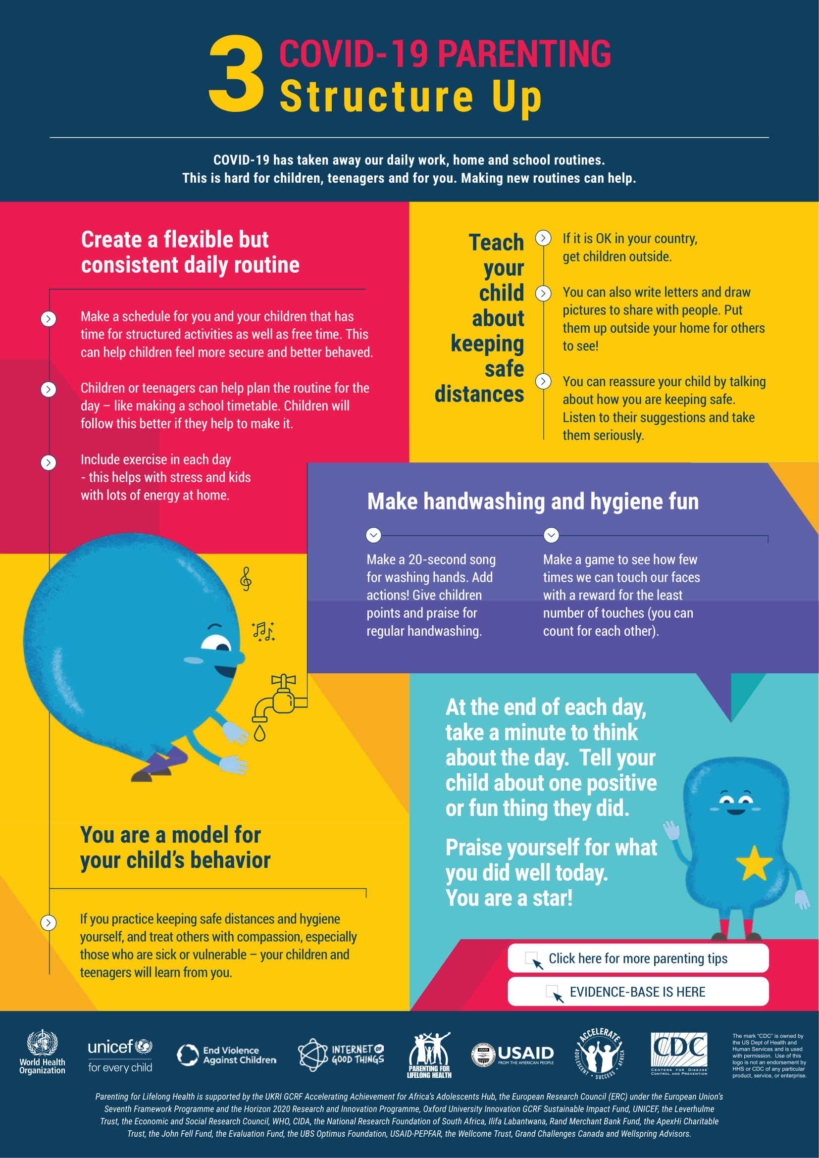 The coronavirus disease pandemic has upended family life around the world. School closures, working remote, physical distancing — it’s a lot to navigate for anyone, but especially for parents. UNICEF teamed up with the Parenting for Lifelong Health initiative to bring parents and caregivers a set of handy tips to help manage this new (temporary) normal.