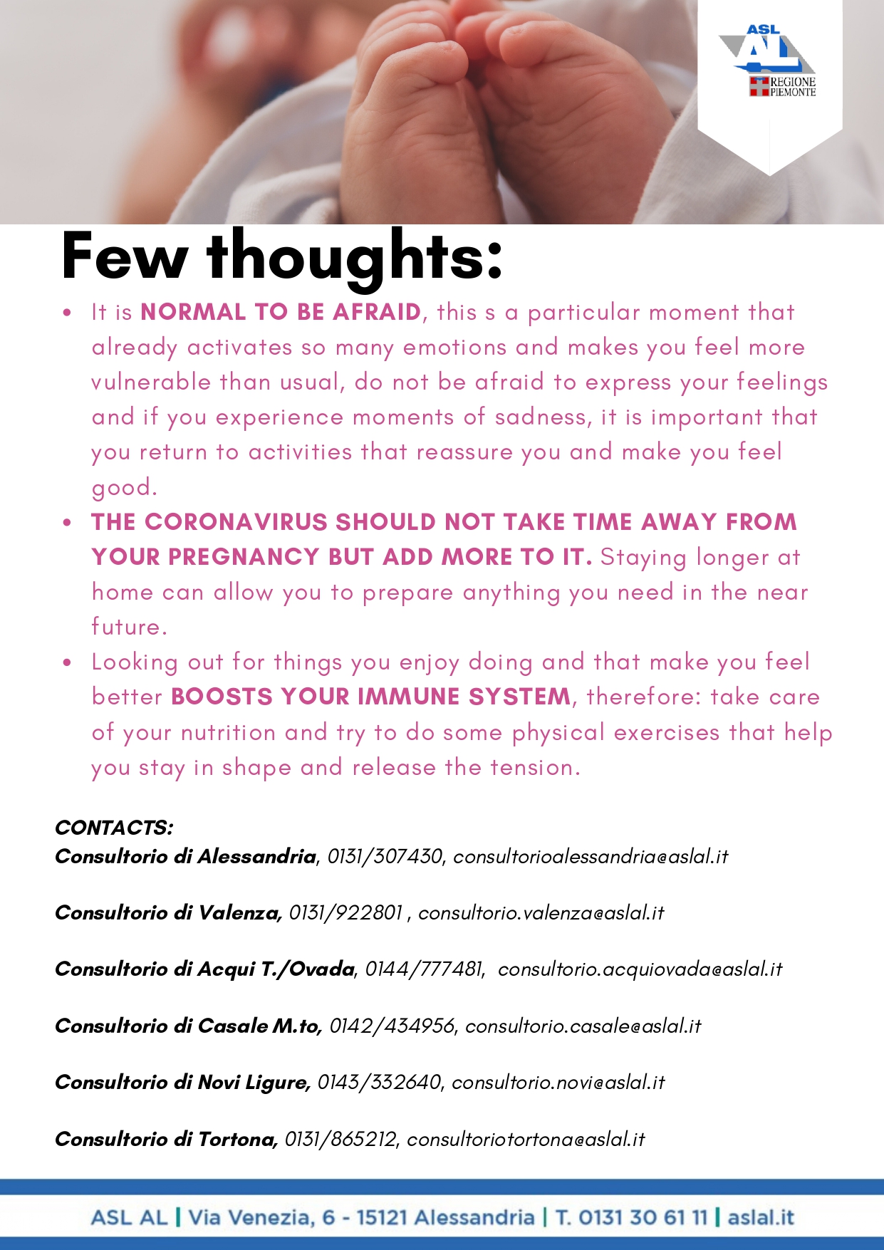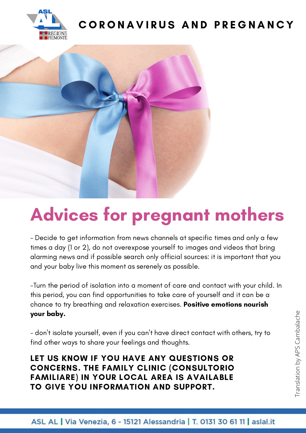 In queste settimane l’ASL di Alessandria ha prodotto alcuni materiali in diverse lingue, rivolti alle donne in gravidanza, per dare loro alcuni consigli su come affrontare meglio questo periodo, anche durante l’emergenza coronavirus.