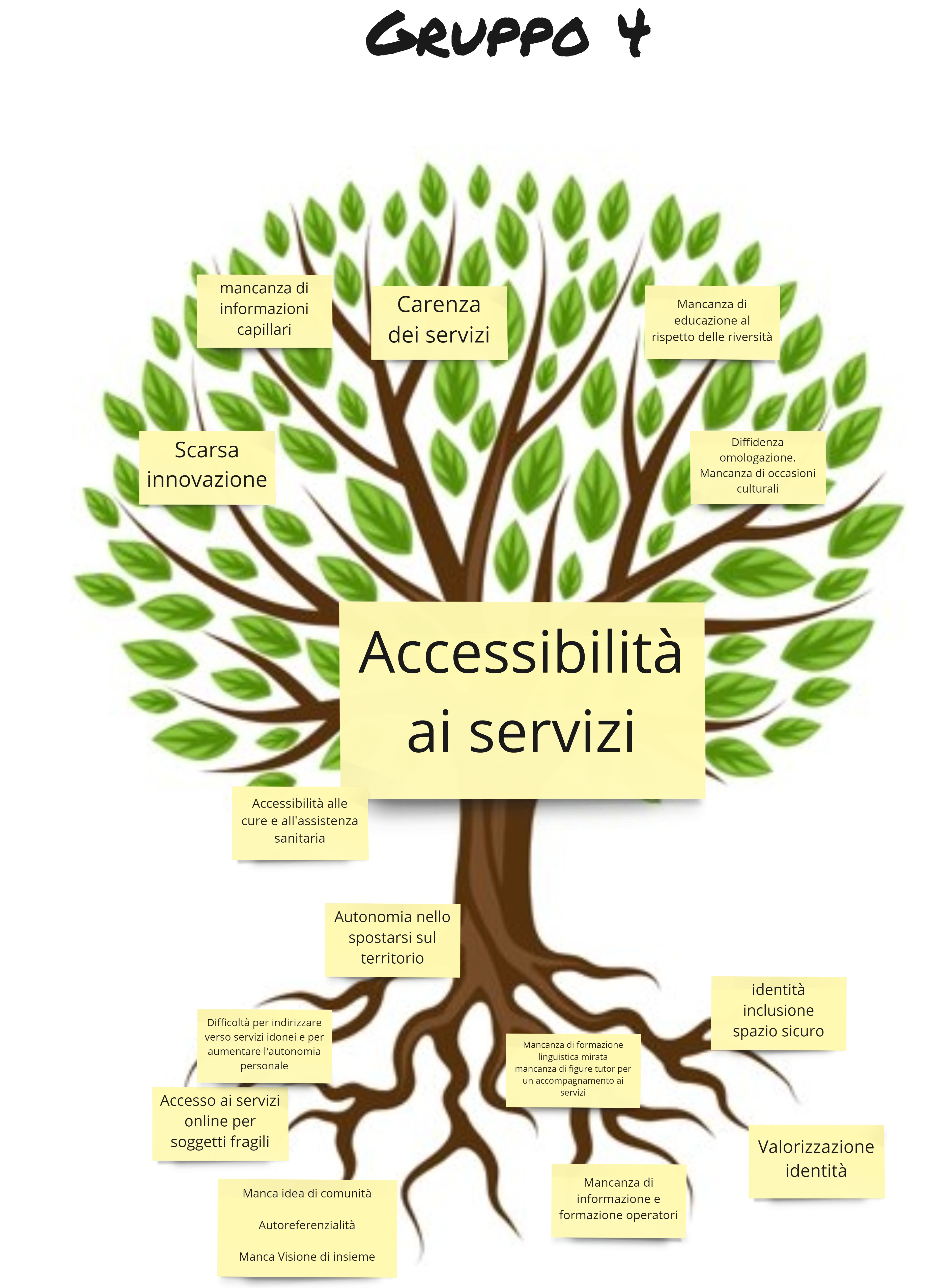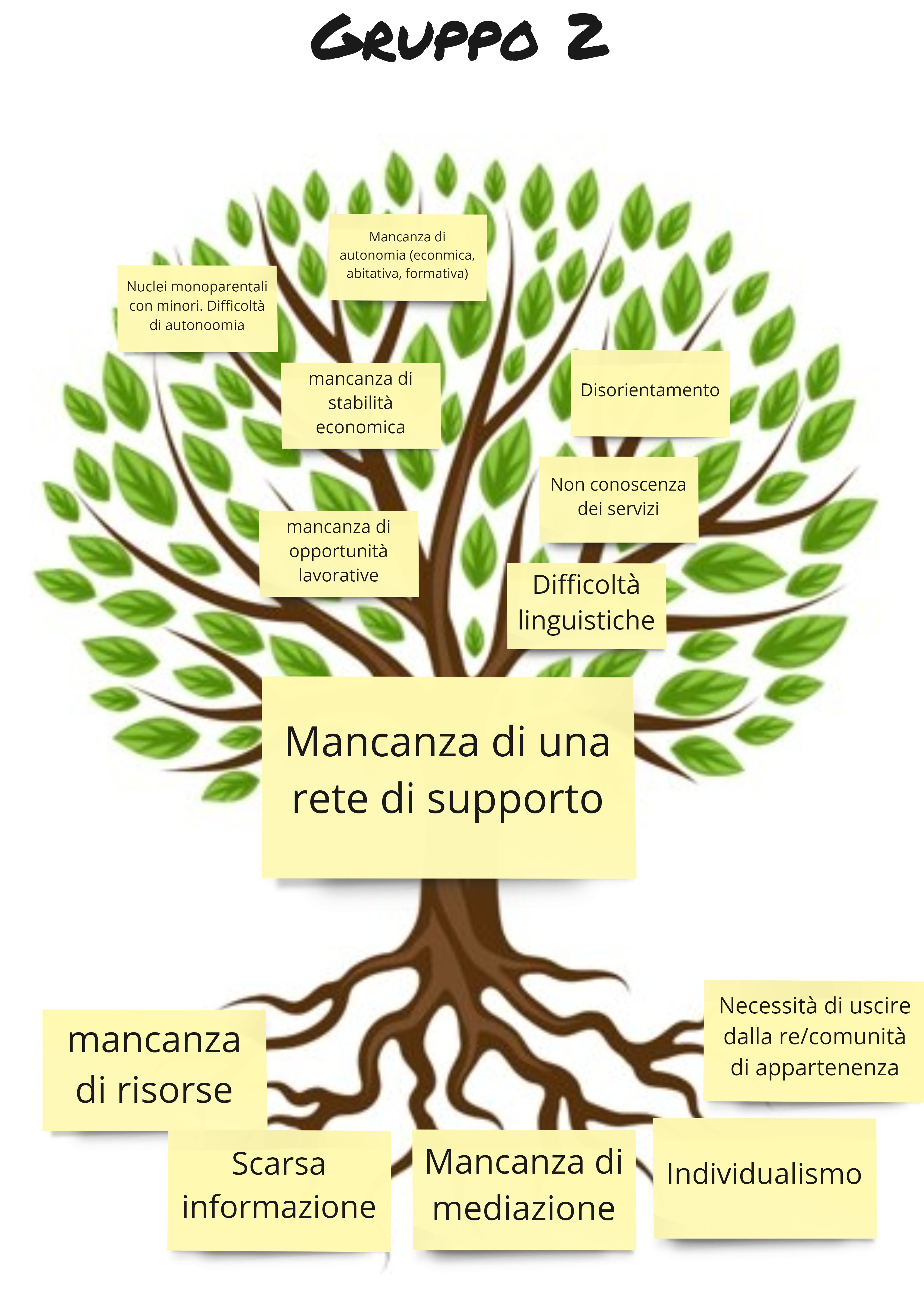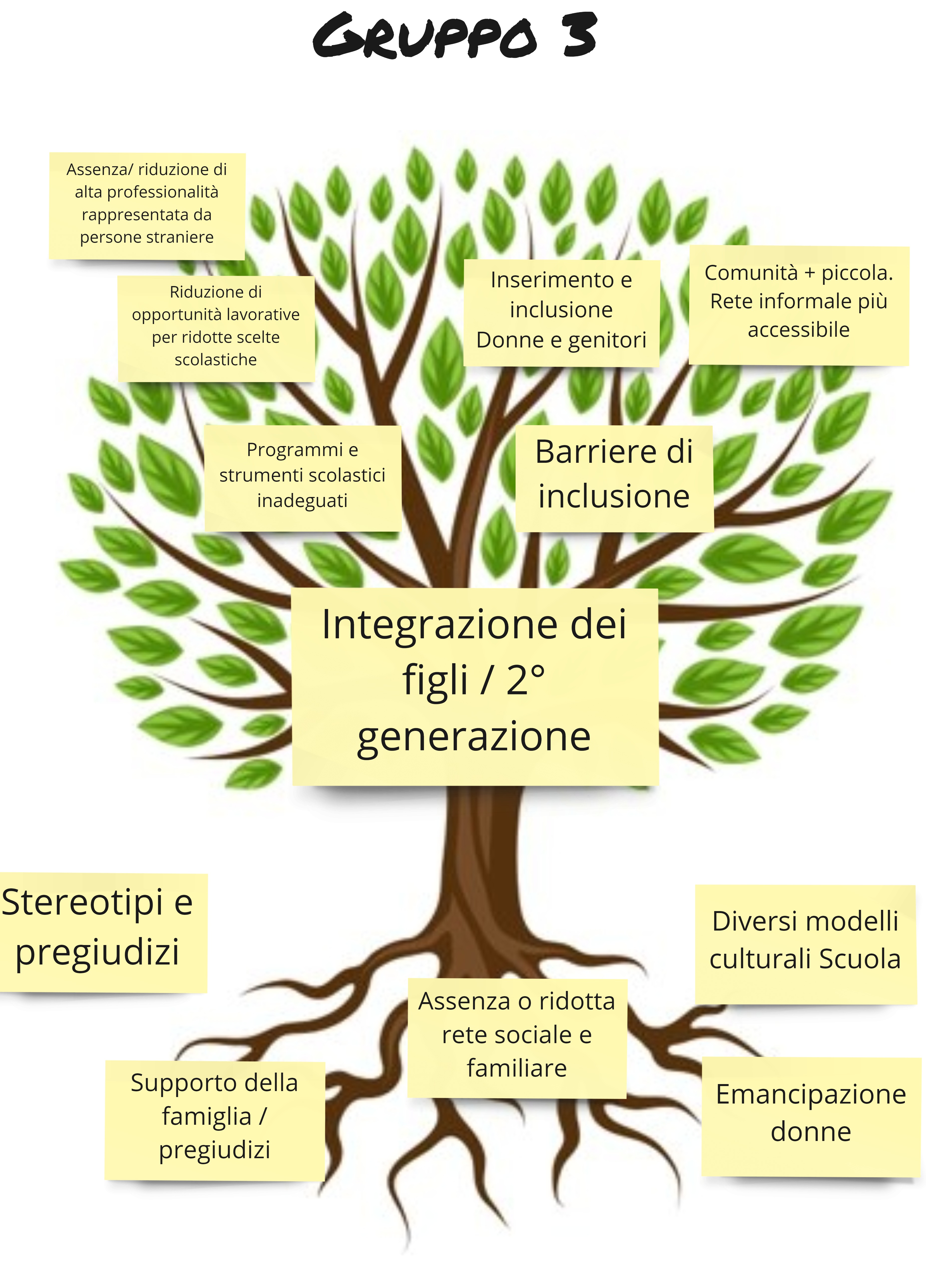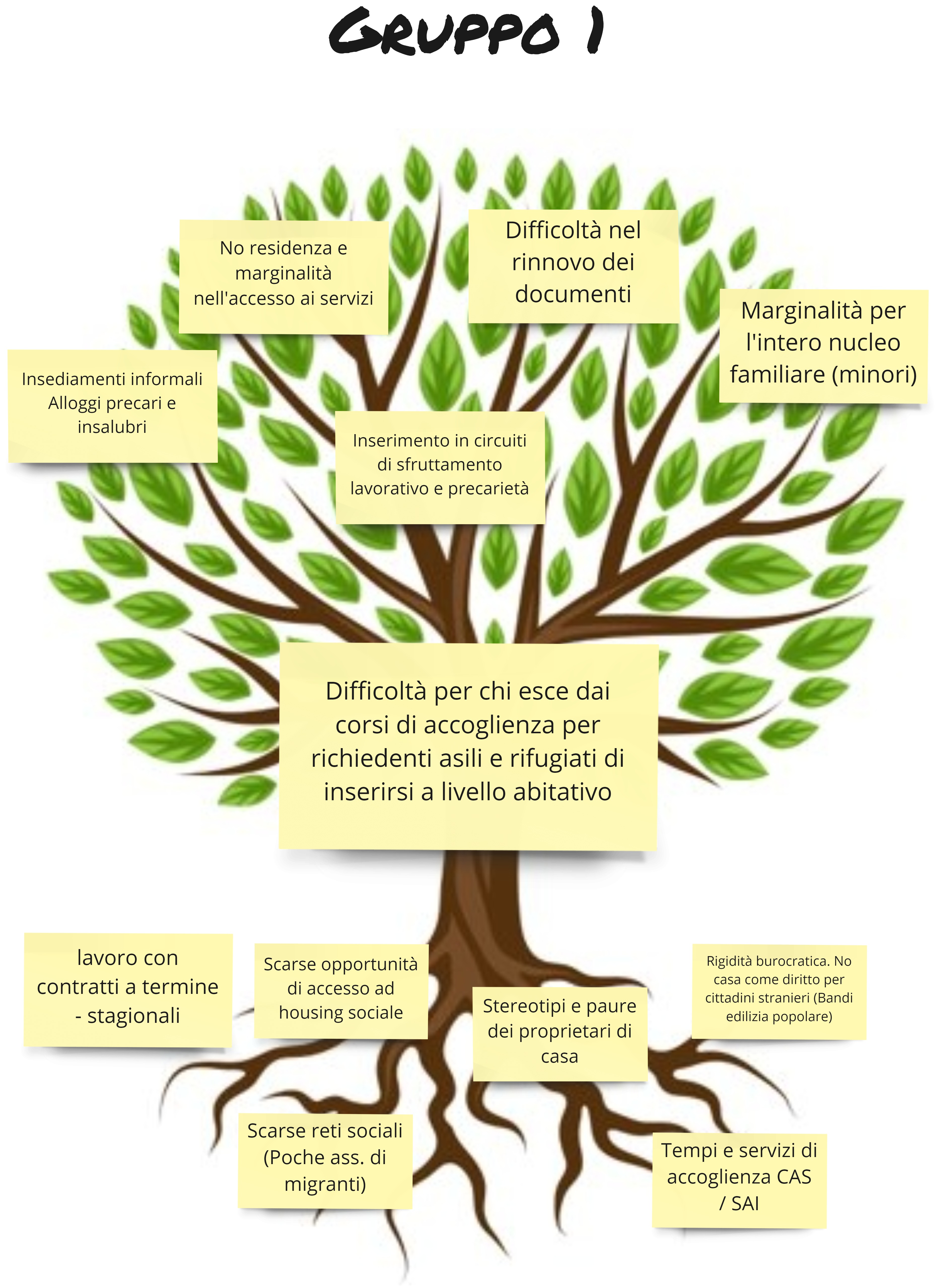 A partire dai confronti tra i singoli gruppi di lavoro, sono emersi come problemi evidenti quello della scarsa accessibilità ai servizi, la scarsa integrazione dei figli di seconda generazione, la mancanza di una rete di supporto e la difficoltà per chi esce da progetti di accoglienza a inserirsi a livello abitativo. Il tutto rappresentato negli alberi in grado di riassumere gli effetti (racchiusi nei rami) e le cause (che si ritrovano invece nelle radici, ossia i fattori strutturali a livello di famiglia, comunità, organizzazione, contesto istituzionale che hanno comportato il problema).